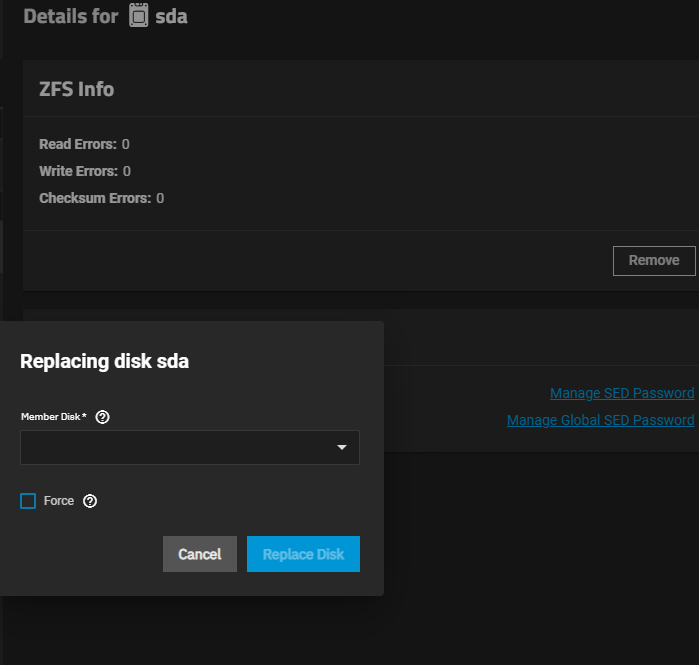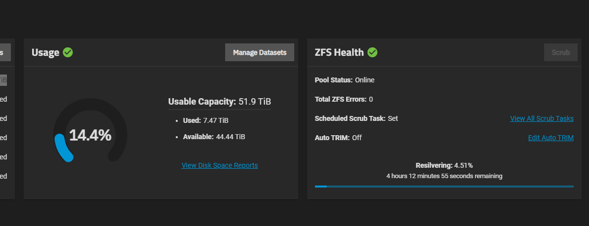 - Afterwards, you're clear to add the new drive to your TrueNAS Scale configuration and then go into your TrueNAS Scale Web GUI and add the new disk to your degraded pool. From there, it should automatically start resilvering and depending on your pool size and use, it can take from 6 hours up to several days. So buckle up and hope for the best!
