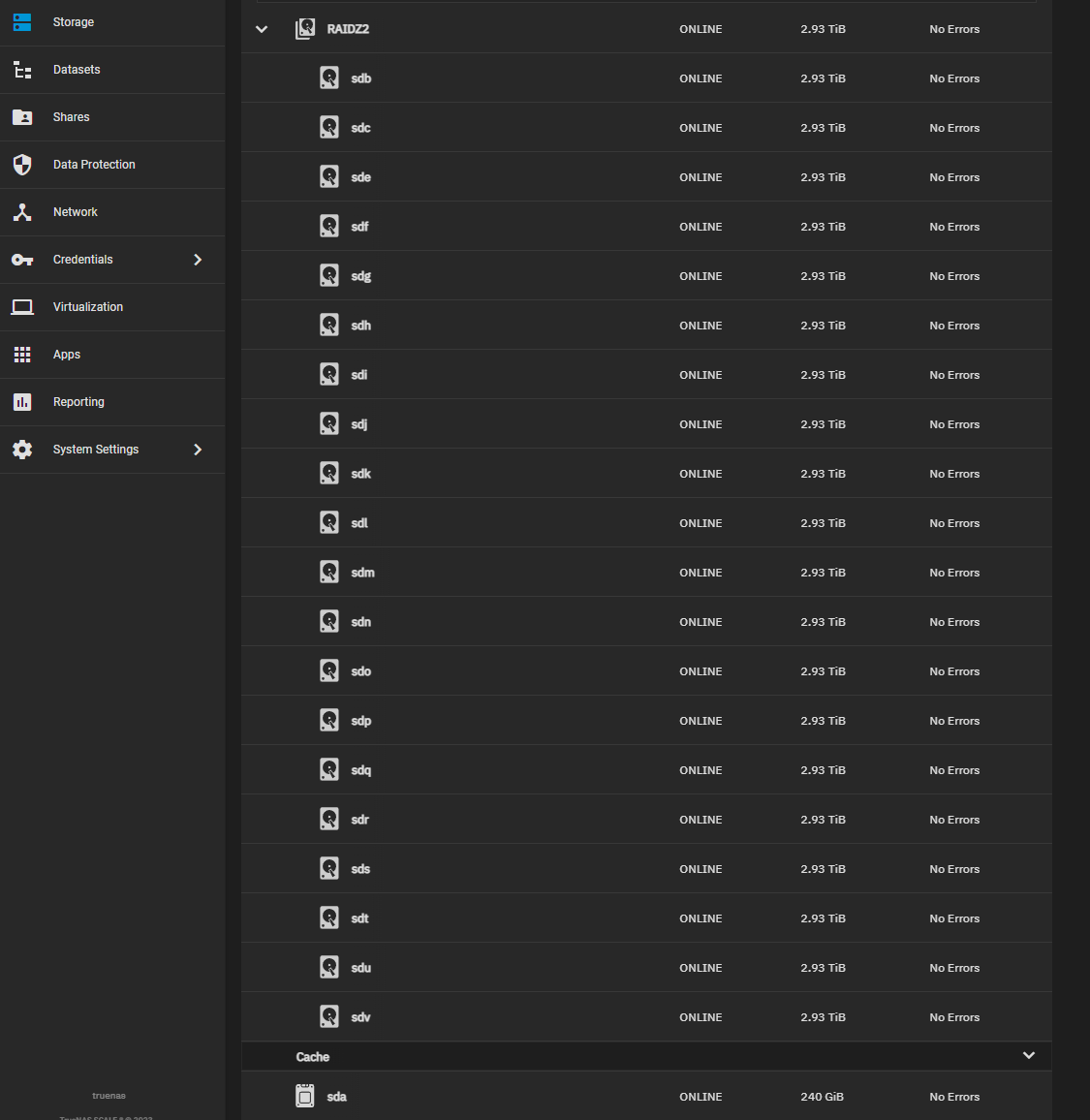 You need to understand that this process only applies to configurations similar to mine, where True NAS Scale is virtualized on Proxmox 7.4-3, all your HDDs are passed through from Proxmox to the VM and then your pool is created inside the VM as a RAIDZ-2.