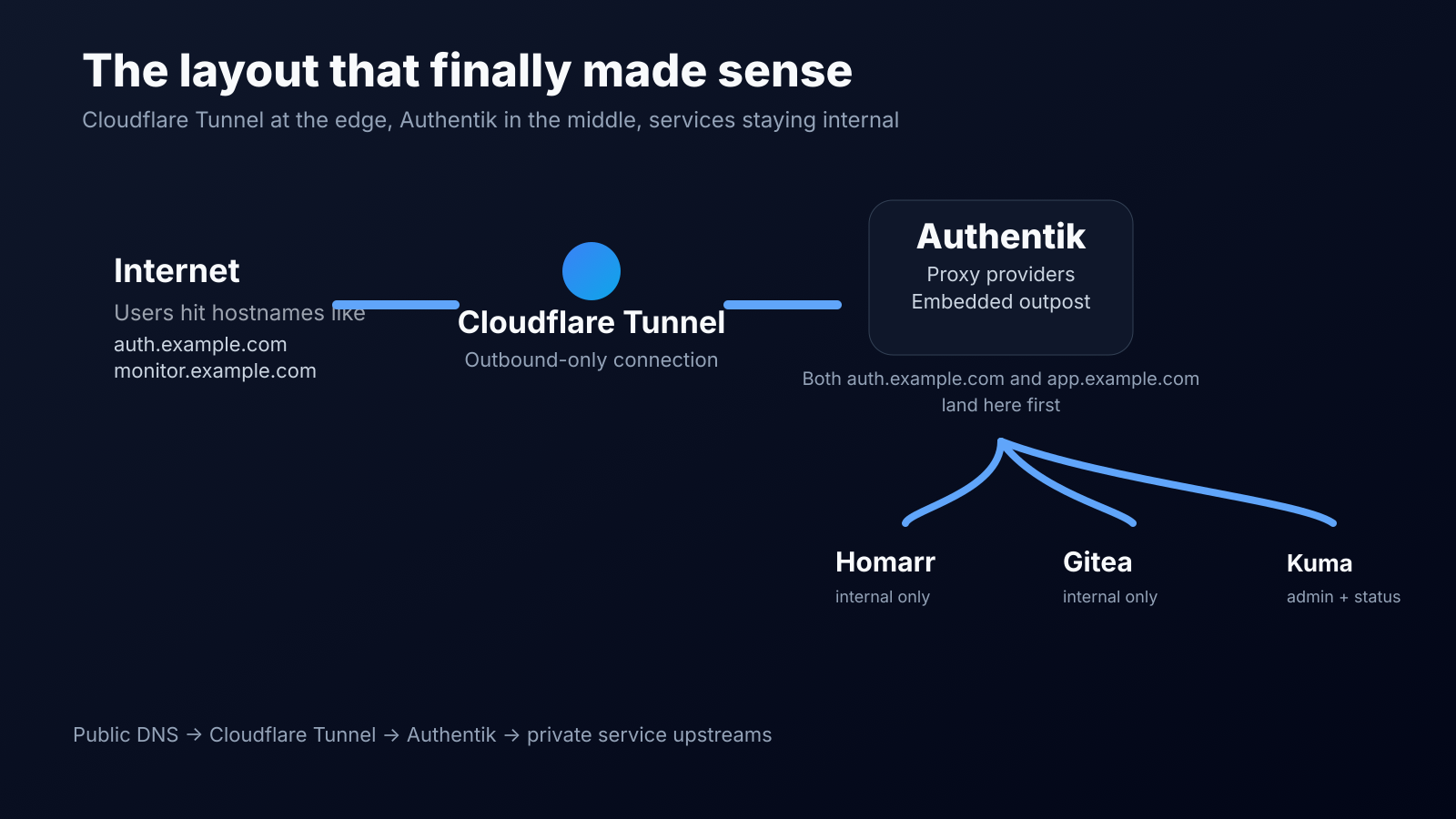 Cloudflare Tunnel handles the public edge, Authentik handles login and policy, and the services themselves stay internal.