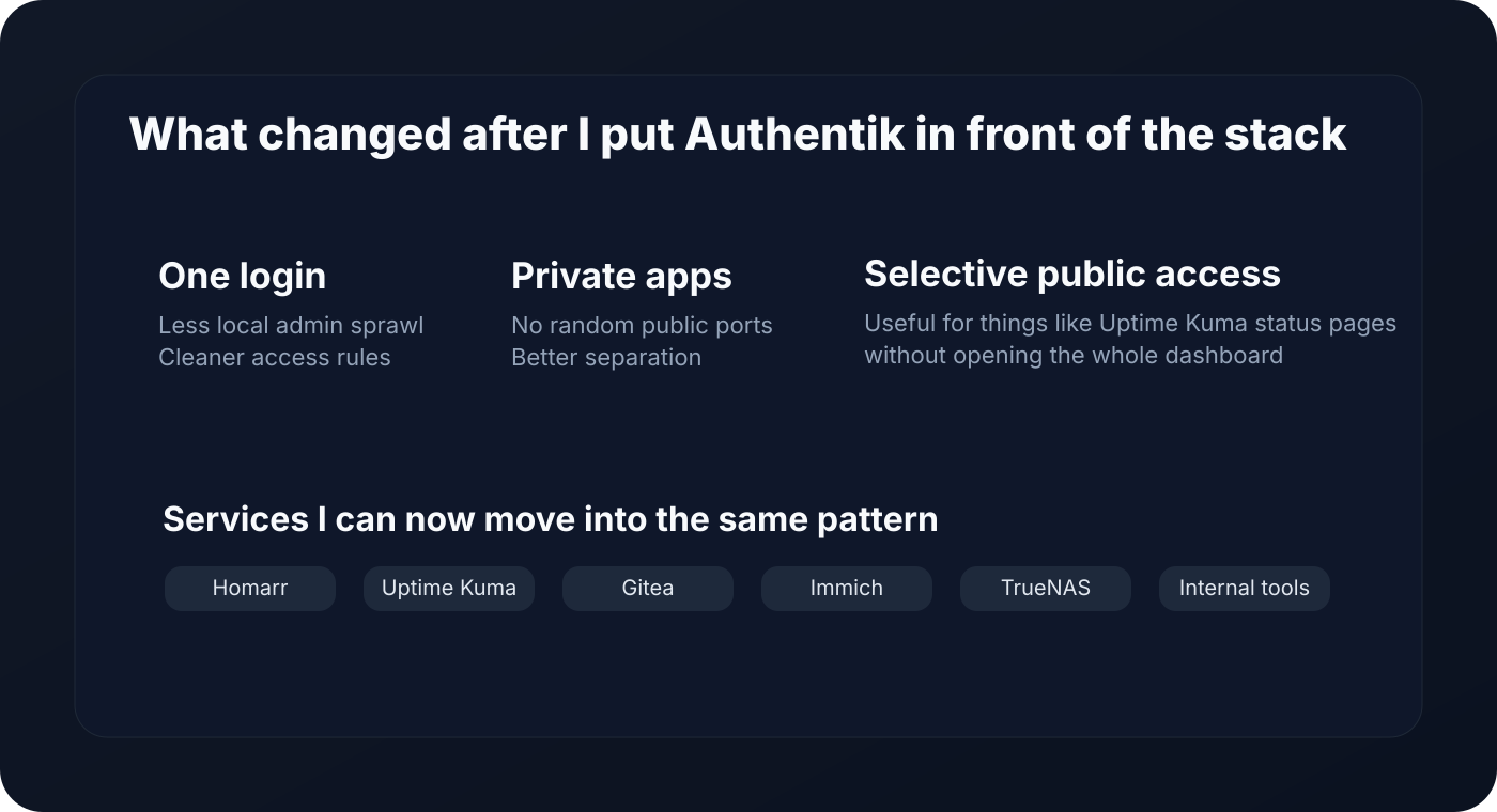 For a long time, my setup worked, but it was messy. Some apps were public, some were only reachable internally, some lived behind random reverse proxy rules, and a few had their own local logins that I didn't really want to keep managing forever. It wasn't terrible, but it also wasn't the kind of setup that gives you confidence when you look at it six months later.